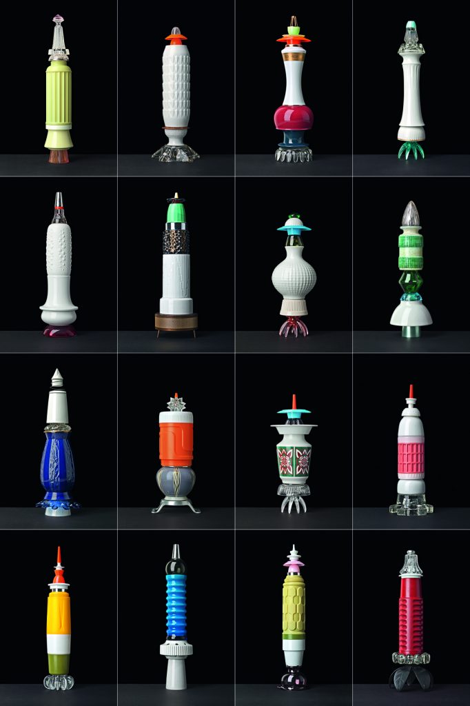 After Gravity’s Rainbow spürt der Frage nach, welche ästhetischen und gesellschaftspolitischen Utopien der Weltraum zu entfesseln vermochte. Das Weltall ist für mich vor allem ein symbolischer Raum: seit Jahrhunderten drehen sich Träume und Visionen der Menschen darum, diesen zu erobern, Welten jenseits der Erde kennenzulernen oder sogar andere Planeten zu kolonisieren. Doch die Meisten, so auch ich, sehen den Weltraum nur von der Erde aus. Was (mir) bleibt ist die Phantasie im Alltag: Salzstreuer, Eierbecher, Teewärmer und diverse Gefäße, um sich mit bizarren Objekten in fremde Welten zu wünschen. Es entsteht eine Serie raketenförmiger Objekte aus Alltagsgegenständen der 70er und 80er Jahre. Rein äußerlich scheinen sie zunächst an Zeiten zu erinnern, als Plastik und abstraktes Oberflächendesign für Leichtigkeit, Flexibilität und eine frohe Zukunft standen.